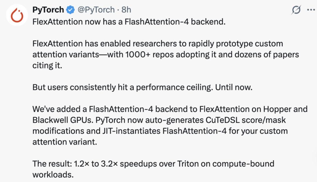 Pytorch 官方宣布 FlexAttention 现已支持 FlashAttention-4 后端。