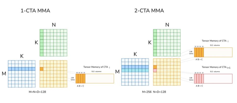 2-CTA MMA:Blackwell 支持在同一 cluster 中由一对 CTA 共同执行一个 UMMA 运算,并跨越两个 CTA 的 TMEM。由 leader CTA 中的一个线程发起 MMA,但在执行期间两个 CTA 都必须保持活跃。通过在这对 CTA 之间拆分 M 和 N 维度,可以将 MMA 的 tile 尺寸扩展到 256×256×16,从而减少冗余数据传输并降低每个 CTA 的资源占用。在一个 kernel 中,CTA 组大小(1 或 2)在 TMEM 操作和 Tensor Core 运算之间必须保持一致。