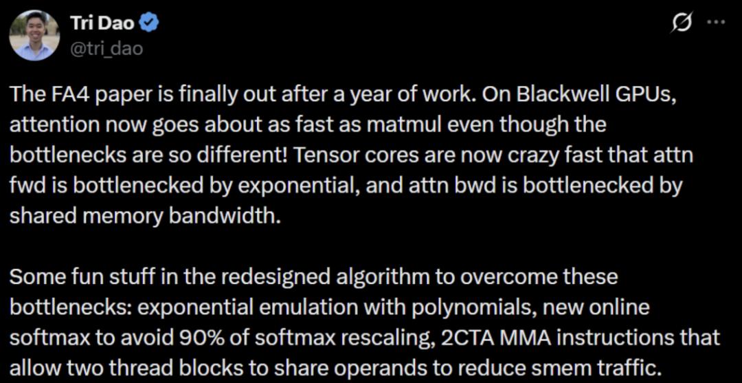 FlashAttention 核心作者、普林斯顿大学助理教授 Tri Dao 表示,在 Blackwell GPU 上,即使瓶颈截然不同,注意力机制的执行速度现在也几乎与矩阵乘法一样快了!