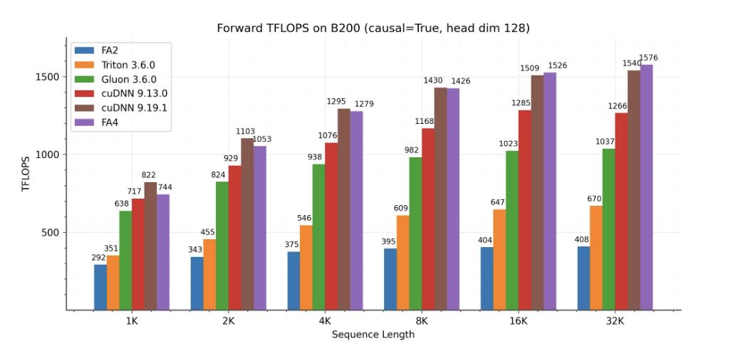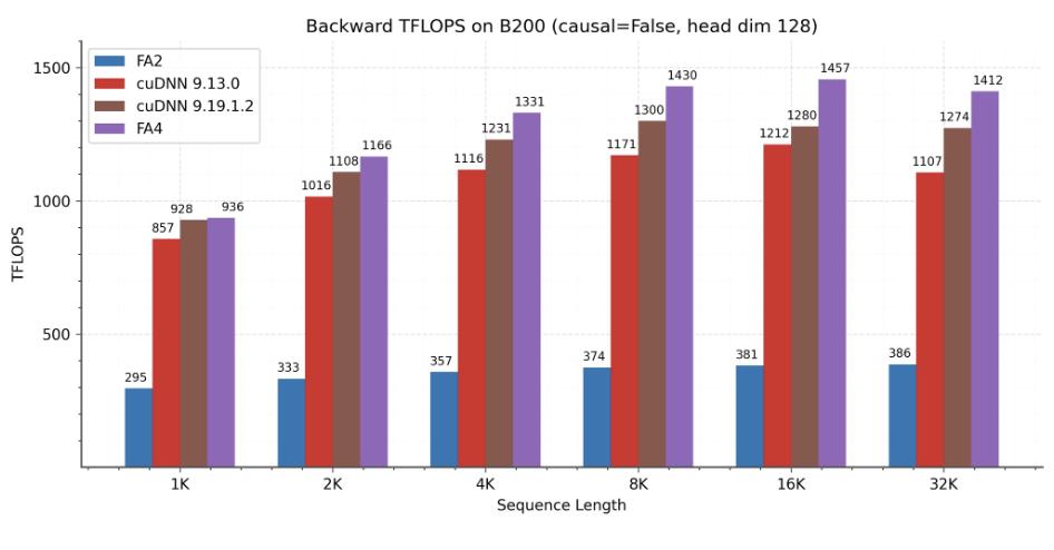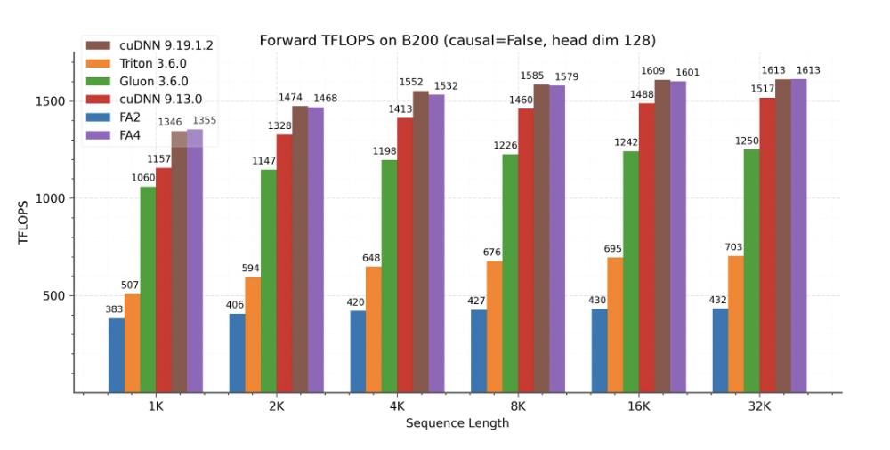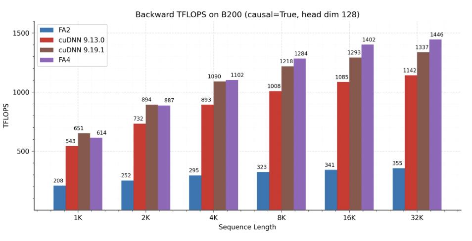 团队展示了 FlashAttention-4 在 B200(BF16)上的性能结果,并将其与 FlashAttention-2 以及 Triton、Gluon 和 cuDNN 的实现进行了对比。