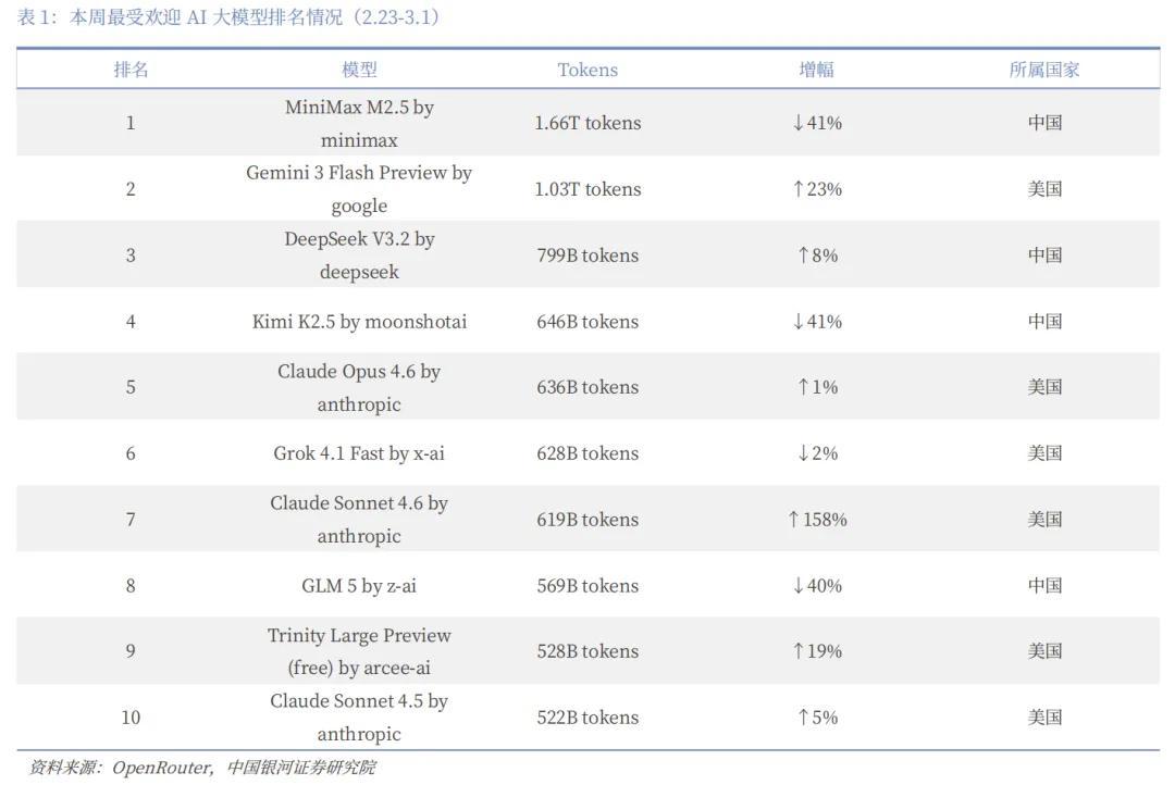 截至2026年2月28日,该平台内前十模型总Token消耗量已突破28.7万亿,其中,国产模型贡献超过14.69万亿,为历史上首次单月Token调用占比过半,且超越了美国模型。