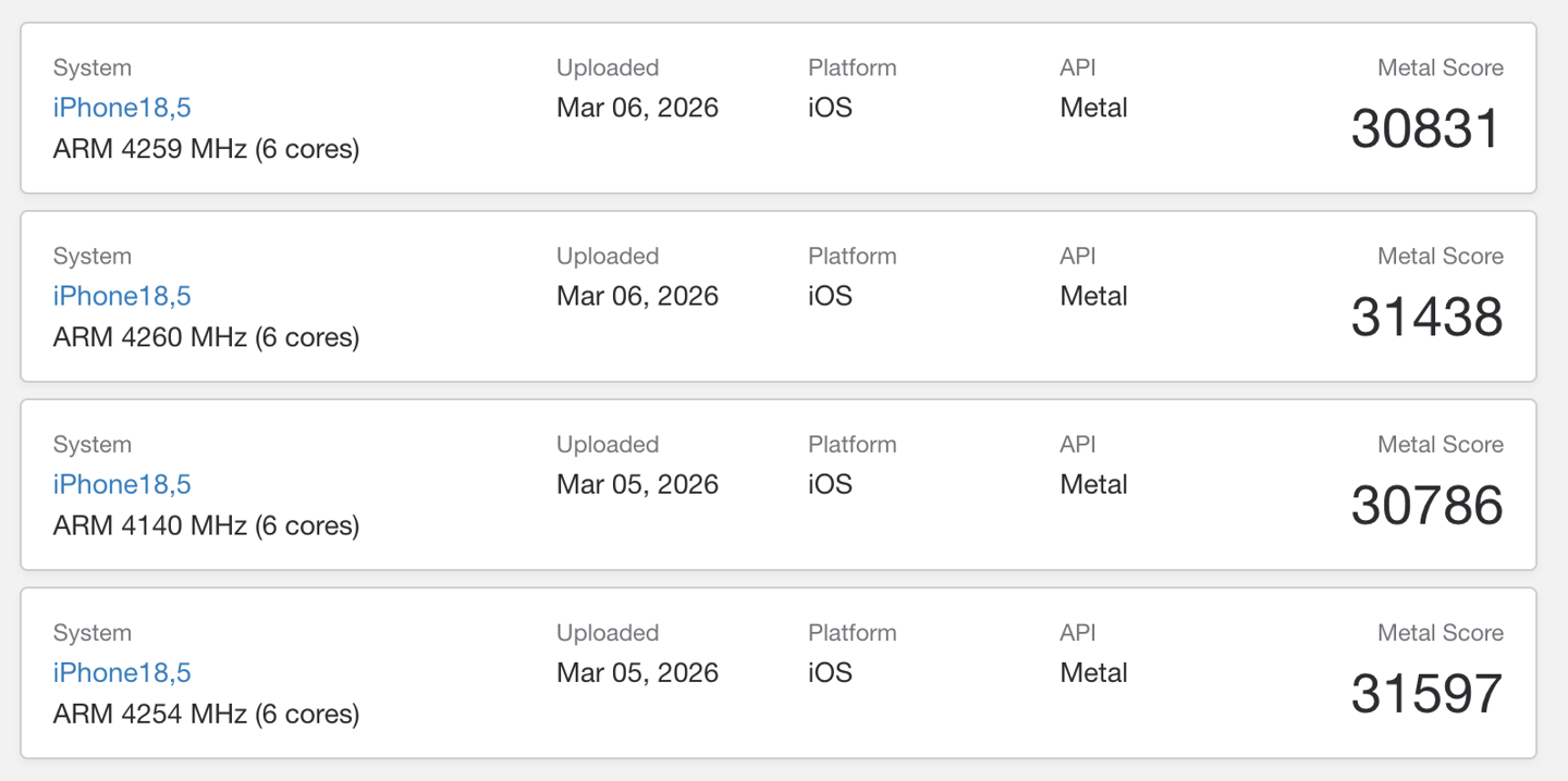不过由于 GPU 核心被阉割,iPhone 17e 的 Metal 图形性能大约是 31000-31500 分,明显低于 iPhone 17 标准版的 37000 分。