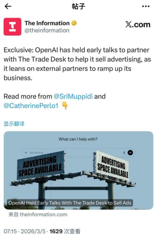 3月5日,美国知名付费财经媒体《The Information》发布独家消息称,Open AI已与程序化广告交易平台The Trade Desk(以下简称TTD)针对广告销售问题进行初步谈判,目的是借助外部合作伙伴推动业务增长。