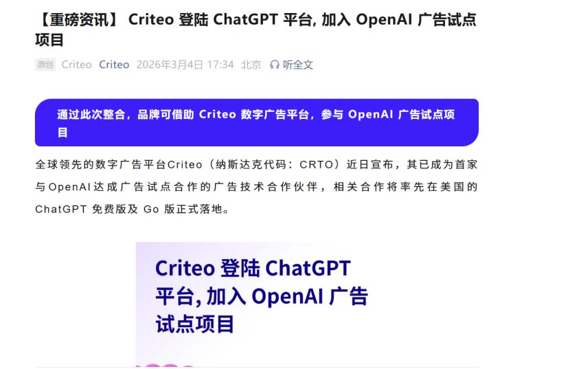 紧接着,3月2日,Open AI又官宣首家广告技术伙伴Criteo(科韬)。