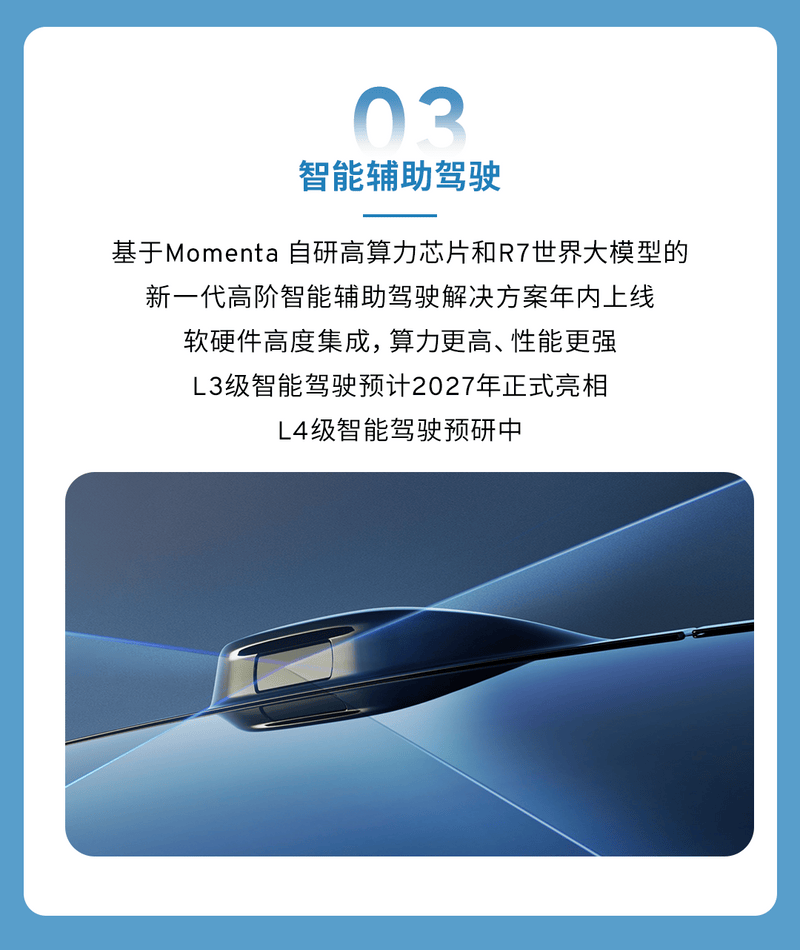 在智能驾驶领域,上汽通用同步披露了技术路线图。基于 Momenta 自研高算力芯片与 R7 世界大模型的新一代高阶智能辅助驾驶解决方案计划于年内上线,软硬件集成度进一步提升。L3 级智能驾驶预计于 2027 年正式亮相,L4 级技术预研也已同步启动。据官方透露,未来三年内,针对 MPV 车型的累计投资将超过 100 亿元,全新超豪华与下一代豪华 MPV 车型的开发工作已启动。