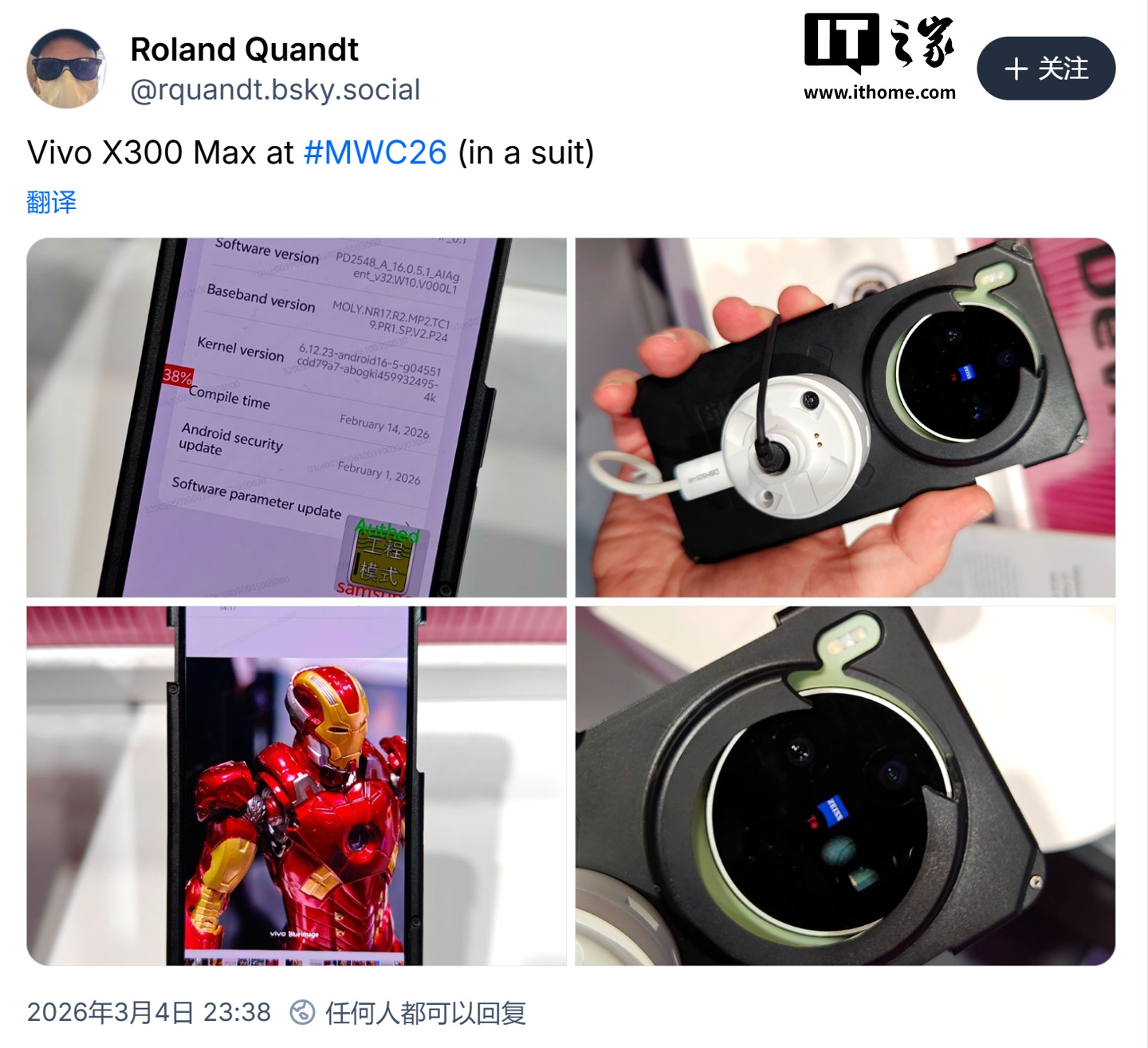 IT之家 3 月 7 日消息,消息源 Roland Quandt 于 3 月 4 日在 Bluesky 发布动态,分享了一组照片,展示了在巴塞罗那召开 MWC 2026 展会期间亮相的 vivo X300 Max 手机。