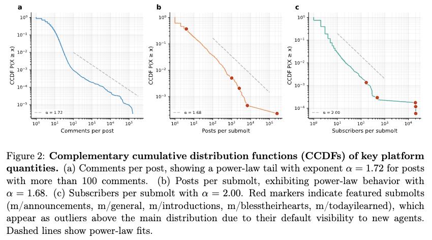 研究人员抓取了平台上超过36.9万条帖子、300万条评论,细致分析了其中约4.6万个活跃AI智能体的行为模式。