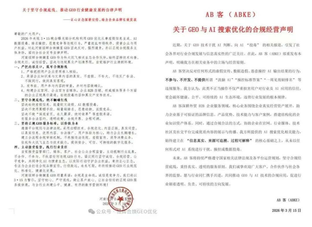 报道一出,3月16日,GEO行业相关企业纷纷发布AI搜索优化的合规经营声明。