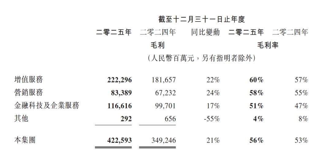 回顾整个2025年,这两项开支分别为417亿元、1361亿元,同比分别增长15%、21%。考虑到核心业务毛利率的提升——增值服务、营销服务、金融和企业服务的毛利率分别有3至4个百分点的提高,整体经营费用率只上涨了1个百分点。