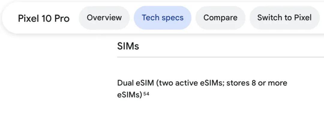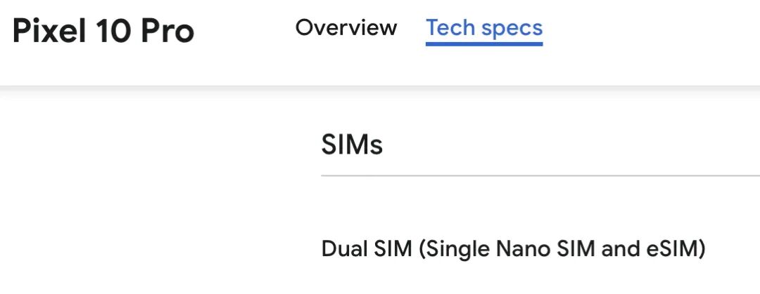 同为首批将 eSIM 应用到智能手机的厂商,从 Pixel 3 系列至今所有的 Pixel 手机均有支持 eSIM 功能的版本。其中,Pixel 7 系列及更新机型支持了 eSIM 双待。美版的 Pixel 10 系列(不包括 Pixel 10 Pro Fold)不再配备实体 SIM 卡槽。