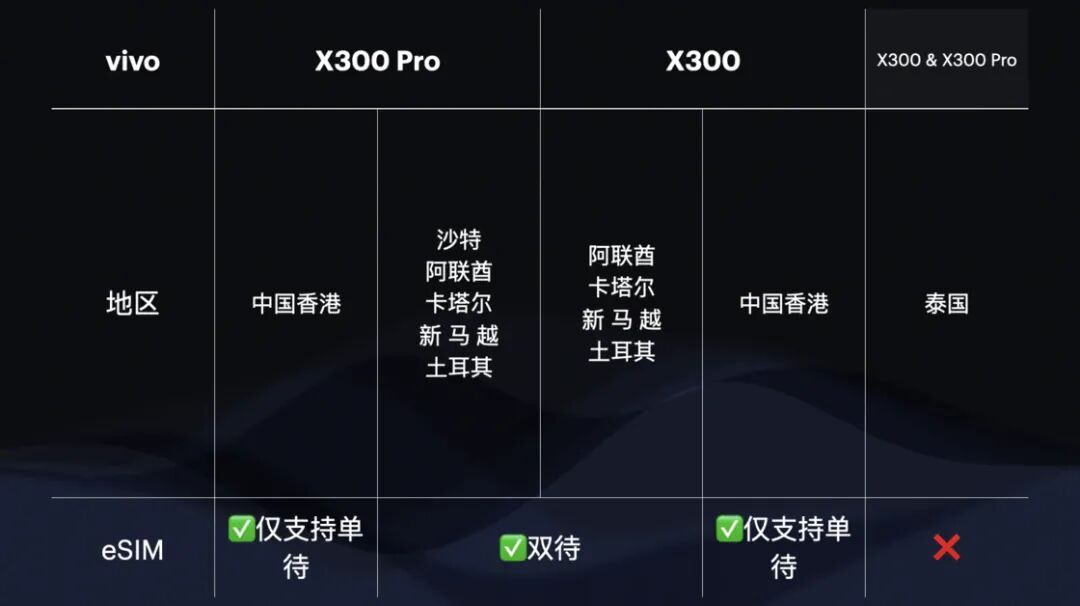 上述所有型号均支持 eSIM 功能,并且 vivo 在几乎所有页面明确标注了支持 eSIM 双待的情况。令人意外的是在泰国销售的版本完全不支持 eSIM 功能;在香港销售的版本仅支持 eSIM 单待;其他型号与版本在提供销售的地区均支持 eSIM 双待,且均配备双实体 SIM 卡槽。