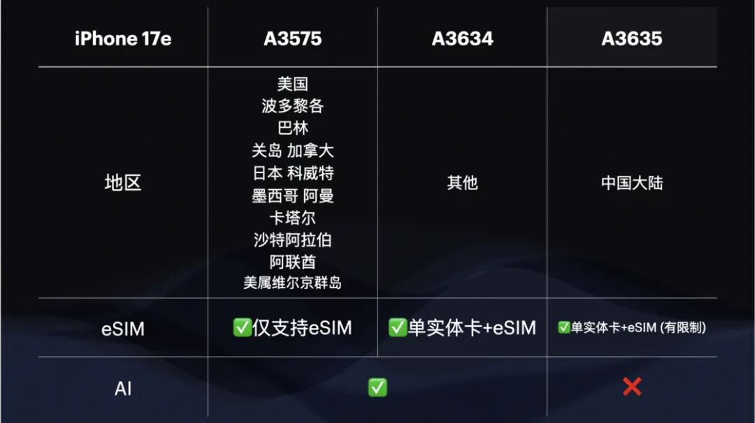 随后登场按时间顺序登场的是 OPPO Find X9 Pro 卫星通信版、HUAWEI Mate 80 RS 和荣耀 Magic 8 Pro Air,三款产品均配备了双实体 SIM 卡槽,但 eSIM 仅支持单待。iPhone 17e 的国行版本采用单实体 SIM 卡槽加 eSIM 的设计,eSIM 支持双待,型号 A3635。