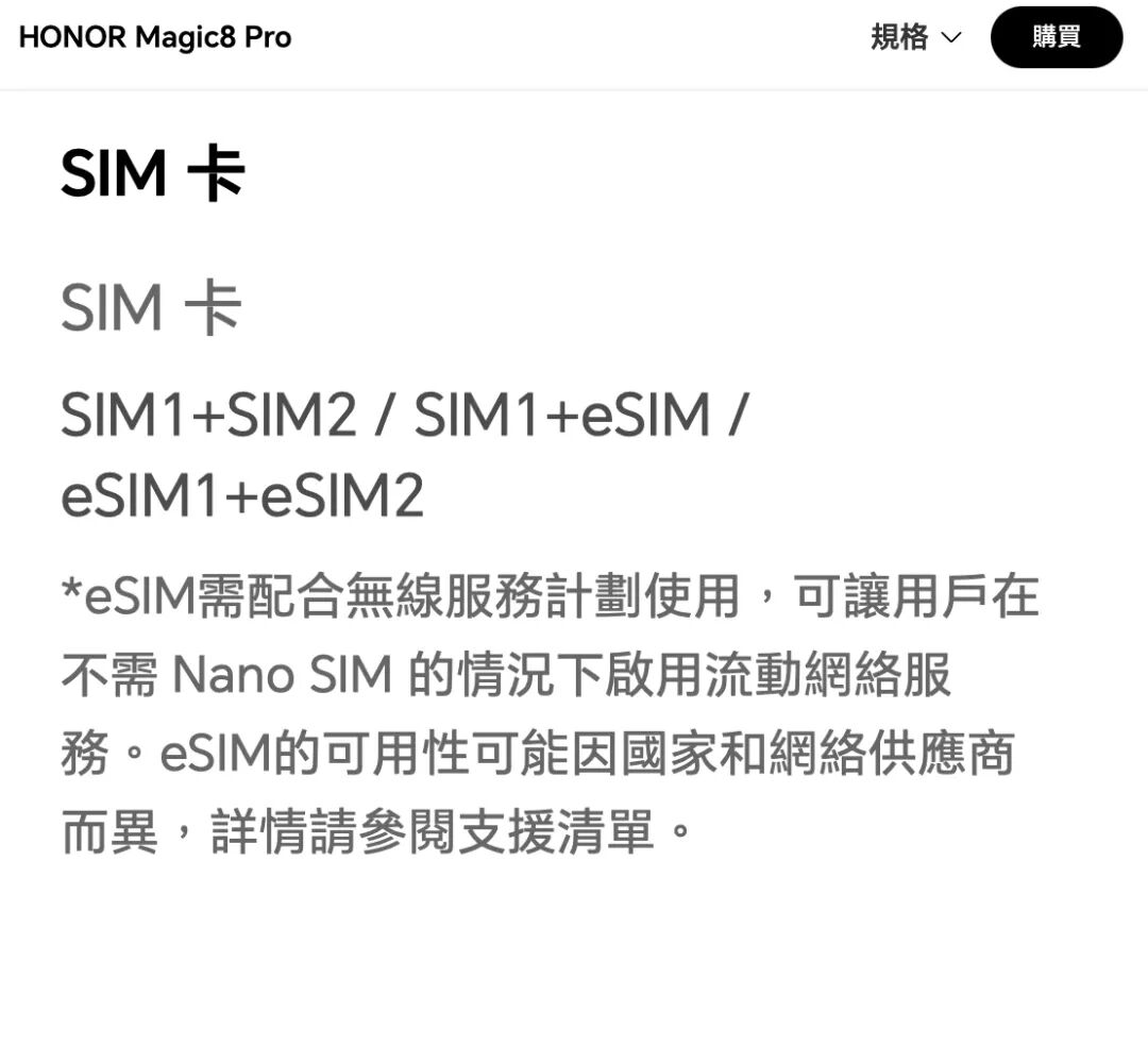 荣耀的独立导致其在海外的业务受到了很大的影响。几年过去,目前荣耀的出海产品无论在型号数量还是销售地区的覆盖方面都表现良好。其中 Magic8 Pro 和 Magic V5 在提供销售的地区均支持 eSIM 双待;400 系列的机型在提供销售的地区仅支持 eSIM 单待。所有机型均配备双实体 SIM 卡槽。