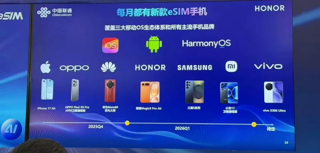 一月下旬,一张来自中国联通的幻灯片在回顾已上市支持 eSIM 功能国行版本智能手机的同时,也一并透露了接下来具备 eSIM 功能国行手机的推出计划。2 月 27 日,三星发布的 Galaxy S26 系列手机国行确认支持 eSIM;vivo X300 Ultra 也离发布不再遥远。