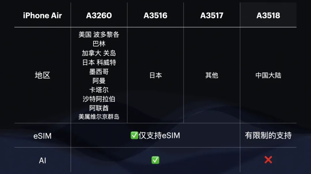 目前中国大陆地区已上市且支持 eSIM 功能的智能手机总计 5 款。首款上市的是 iPhone Air,是 Apple 2025 年秋季推出 4 款新品的国行版本中唯一支持 eSIM 功能的 iPhone。其特点是仅支持 eSIM 功能,没有实体 SIM 卡槽,eSIM 支持双待,型号 A3518。