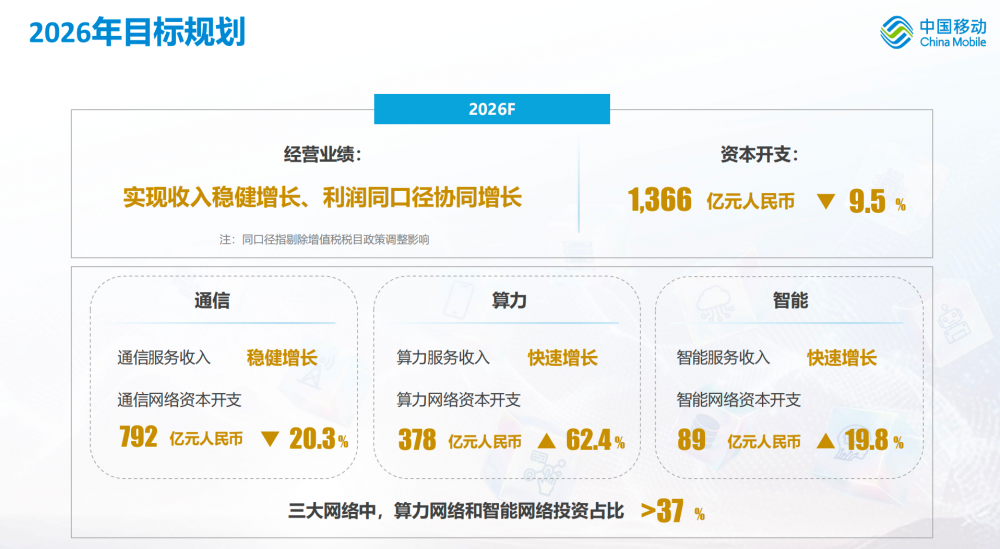 2026年中国移动资本开支计划为1,366亿元,同比下降9.5%,其中算力网络投资、智能网络投资分别增长62.4%、19.8%。三大网络中,算力网络和智能网络投资占比超37%。