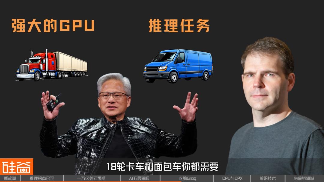 Groq通过SRAM(静态随机存取存储器)设计,天生就适合做推理和token生成。就像Groq创始人Ross打动黄仁勋的那个类比,他说强大的GPU就像“18轮大卡车”,但推理任务就像“最后一公里配送”,本身就更适合更灵活高效的面包车。他对老黄说,如果你要为美国建立一个物流网络,最佳答案是,18轮卡车和面包车你都需要。