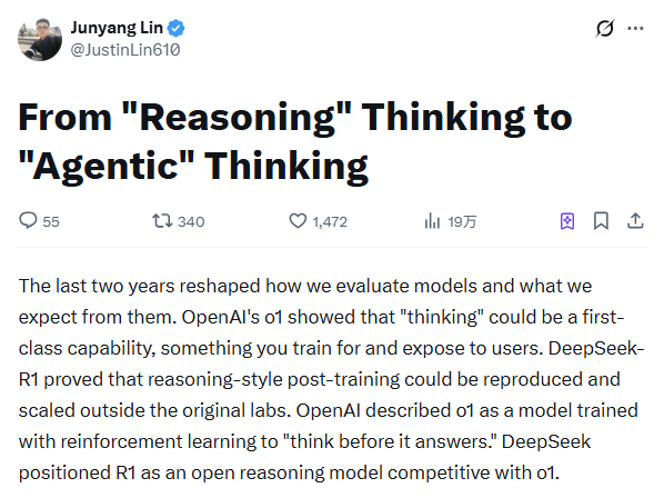 凤凰网科技讯 3月26日,前阿里千问技术负责人林俊旸离职后发表长文,明确指出AI大模型的发展路线正在经历重大跨越,核心竞争焦点正从“推理型思考(Reasoning Thinking)”全面转向“智能体思考(Agentic Thinking)”。文章复盘了以OpenAI o1和DeepSeek-R1为代表的第一波推理模型浪潮,指出这标志着行业从扩大预训练规模,正式步入扩大强化学习(RL)后训练规模的新阶段,数学与代码等可验证领域成为优化模型正确性的核心试金石。