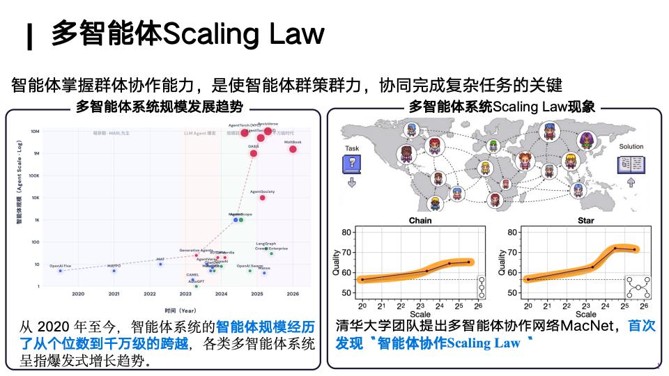 如果之后有了端云结合,可以想象,会有更多的设备开始养虾。我们再看多智能体(Multi-Agent)系统,过去若干年整个多智能体系统的发展速度令人印象深刻。从 2020 年 OpenAI Five 的个位数 Agent 到 2026 年 Moltbook 上 150 万 Agent 的自主社交,规模跨越了六个数量级。