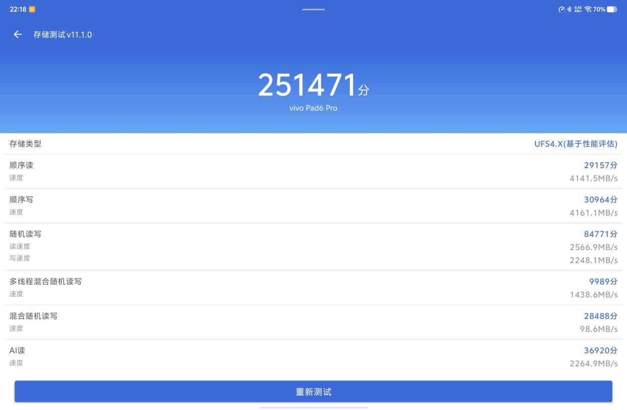 存储性能方面,还是使用《安兔兔评测》进行测试,得到 251471 分的成绩,其中顺序读的速度为 4141.5 MB/s,顺序写的速度为 4161.1MB/s,随机读写的速度分别为 2566.9MB/s 和