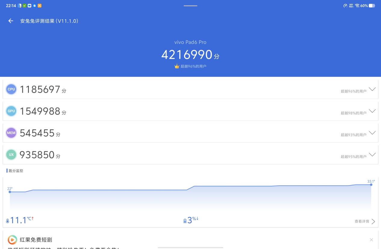 整体来说,第五代骁龙 8 至尊版平台加持的 vivo Pad6 Pro 在性能上显示是不用担心的了,虽然整体性能释放的策略还是稍偏保守地,但目前主流的大型游戏也都能比较轻松地应对,日常使用地性能需求更是不在话下。