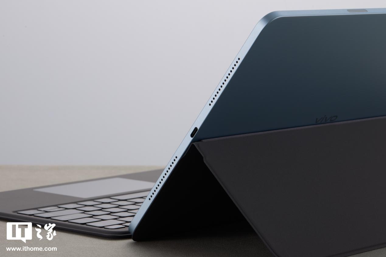 正如前文所说,vivo Pad6 Pro 采用直角中框设计,中框和背面是细窄的曲线过渡,手感偏锐利一些。以横向来看,中框顶部是音量键、麦克风和磁吸模块,左侧是电源键和扬声器,右侧是扬声器和 USB-C 接口,底部没有任何按键元素。