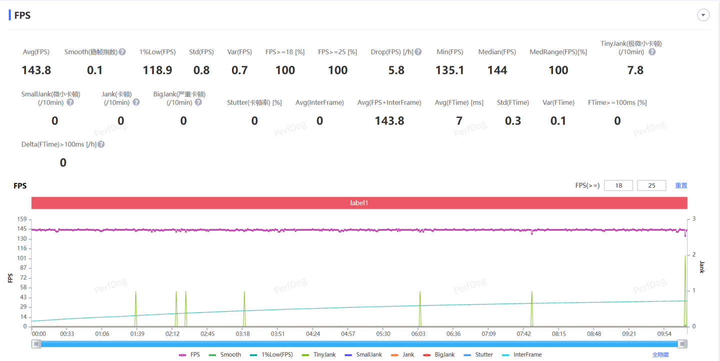 下面我们再来看 vivo Pad6 Pro 在实际游戏场景中的性能表现。首先是IT之家用《王者荣耀》进行测试,测试时将游戏画质选项调到最高,平板设为性能模式。结果不出意外,面对《王者荣耀》这样的游戏,vivo Pad6 Pro 能够以 143.8 FPS 的帧率平稳运行,全程帧率曲线几乎没什么波动,就像一条直线,游玩体验自然也是丝滑流畅的。