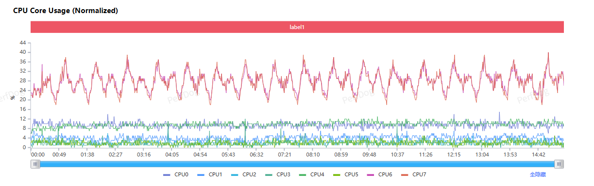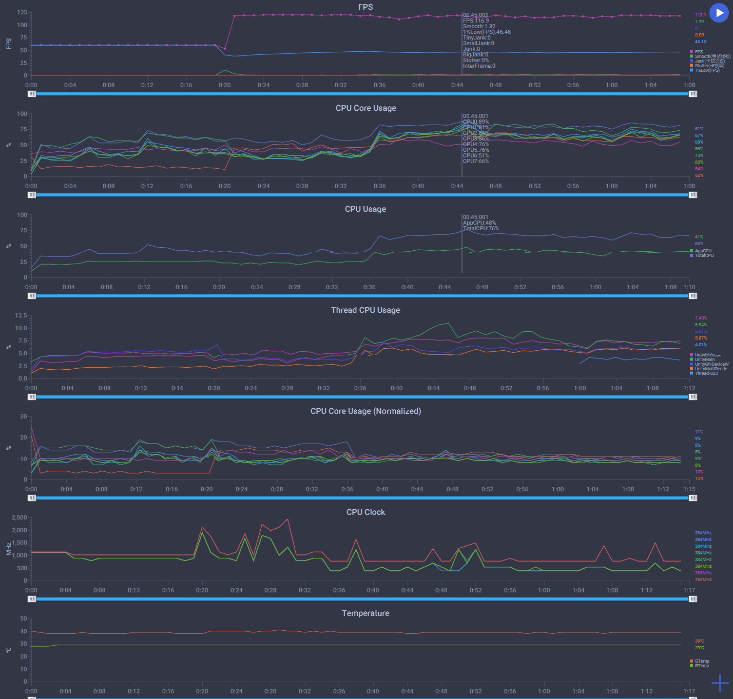 观察 CPU 核心的调度情况,可以看到游戏过程中主要是 2 枚最高主频 4.6GHz 的超大核心在持续发力,整体 CPU 频率大约在 1 GHz-2GHz 上下波动,超大核偶尔会冲高到 3.0GHz 以上然后迅速回落,8 枚核心的性能调度还是比较合理的,同时可以看到第五代骁龙 8 至尊版也没有发挥全力。
