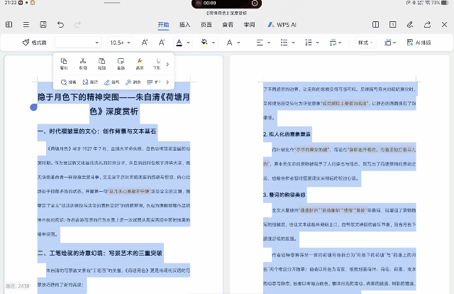 值得一提的是,小 V 写作是全局的功能,除了在原子笔记中,你还可以在各种第三方应用中使用小 V 写作,在第三方应用中则是通过 vivo 输入法来呼出小 V 写作。比如小编在《WPS》中呼出小 V 写作,让它帮我将一篇《荷塘月色》的赏析解读文章进行总结提炼,小 V 写作能够流畅地进行全文总结,然后输出到文档中,非常方便。