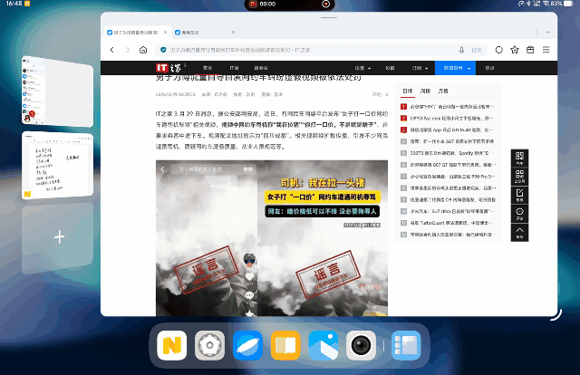 首先要说的就是 vivo Pad6 Pro 的原子工作台,类似于 iPad OS 的台前调度,在 vivo Pad6 Pro 上,从屏幕右下角往中间划动悬停,就可以呼出原子工作台。开启后,支持至多 5 个应用窗口同屏显示,且互不遮挡。你可以关注多个应用进程,并通过主窗口和原子窗形态在其间快捷切换。