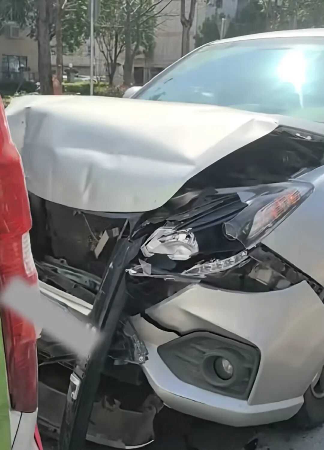 位于最后方的银色车辆损伤最为严重,引擎盖严重向上弯折、变形,前保险杠碎裂,右侧大灯灯罩破损,前格栅也被撞毁,车内安全气囊弹出。