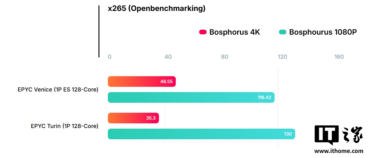 另一个单路 Kenya 平台则搭载 128 核 256 线程样片,配备两根 128GB 高速内存,主要运行了 x265 视频编码测试。