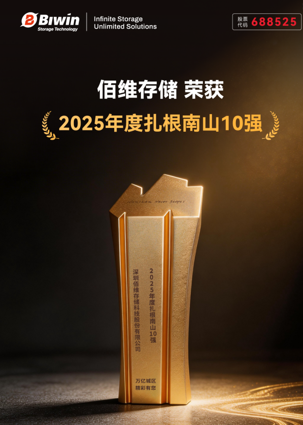 近日,2026南山区企业风采嘉年华在深圳湾春茧体育馆圆满举办,深圳市及南山区主要领导莅临现场,与全区重点企业家、高管代表共同见证这场年度盛会。活动现场揭晓的2025年度南山区企业荣誉榜单中,深圳佰维存储科技股份有限公司凭借卓越的高质量发展成果与突出的产业价值,荣膺“扎根南山十强”重磅殊荣。这一荣誉彰显了公司坚守长期主义的战略定力,以及在技术创新、增长动能、社会责任等方面的卓越表现。