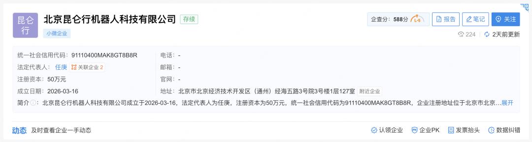 企查查数据显示,北京昆仑行机器人科技有限公司注册于2026年3月16日,经营范围覆盖智能机器人研发、销售,工业机器人制造、销售,同时囊括人工智能应用软件开发、智能控制系统集成等全链条业务(完美贴合具身智能与通用机器人赛道布局)。