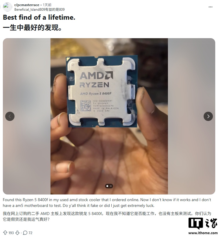 IT之家 4 月 1 日消息,Reddit 用户 Beneficial_Island809 昨日发帖称:他之前下单购买了一款 AMD 原装散热器。当他收货后打开盒子时,发现里面除了散热器之外还有一颗锐龙 5 8400F 芯片。
