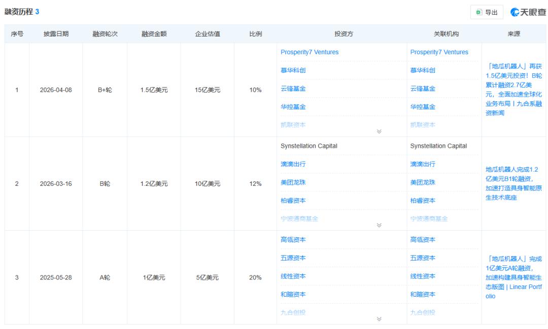 4月8日,地瓜机器人完成1.5亿美元的B2轮融资,距离其B1轮融资仅过去20余天,两轮融资额累计达2.7亿美元(约18.45亿人民币)。