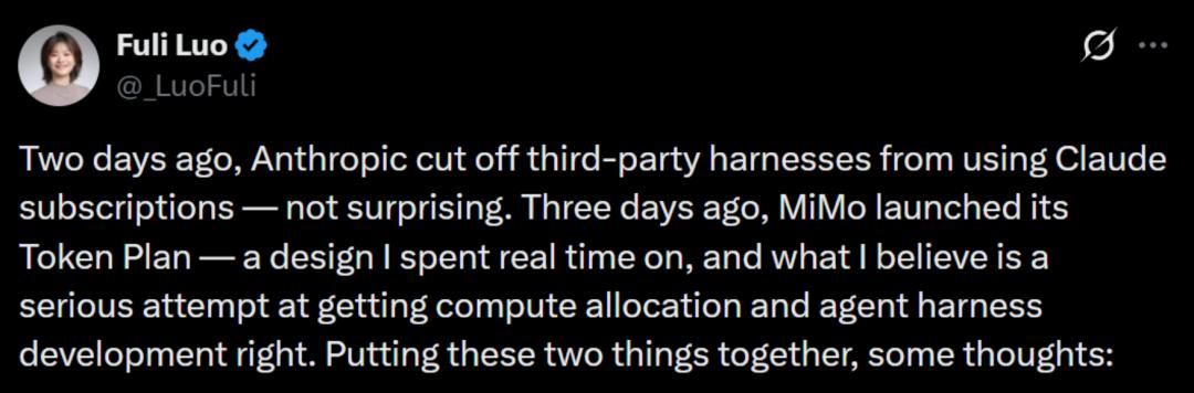 几天之前,Anthropic突然宣布切断第三方工具对Claude订阅的访问权限,这也是罗福莉发文讨论Token定价逻辑的契机。