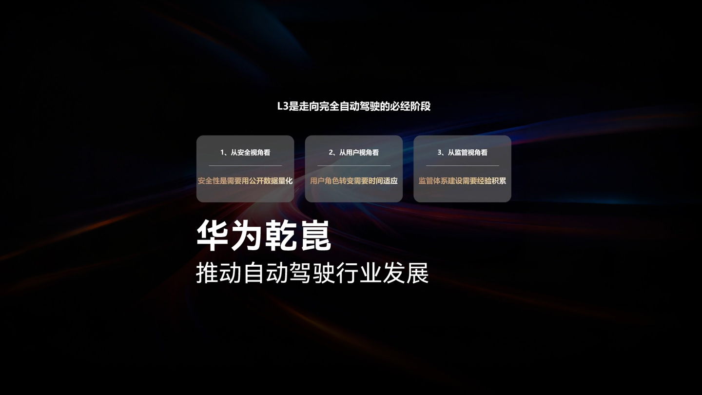 华为方面表示,坚信 L3 级有条件自动驾驶是走向 L4 和 L5 完全自动驾驶的必经阶段,让数据持续积累、用户适应角色变化、法律法规与保险积累经验。