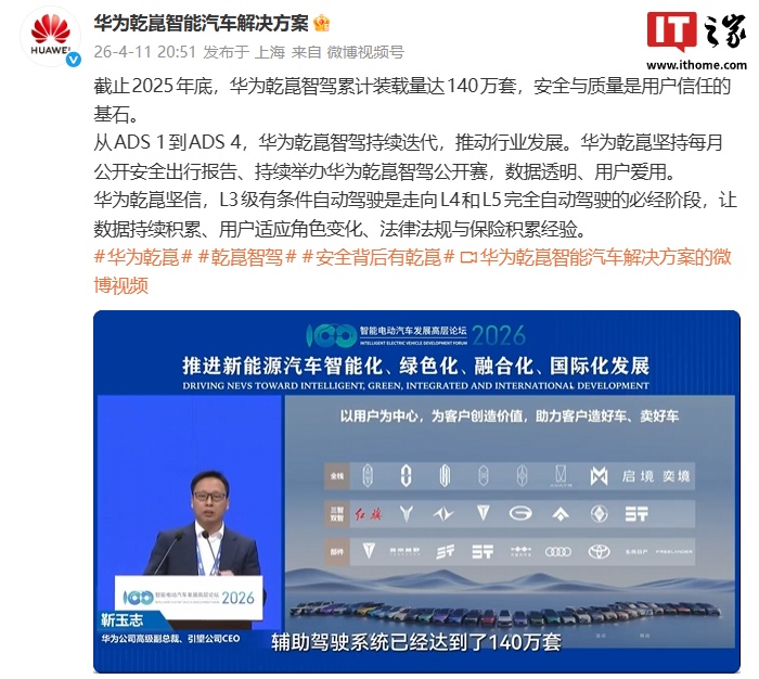 IT之家 4 月 12 日消息,华为乾崑智能汽车解决方案昨日公布数据:截止 2025 年底,华为乾崑智驾累计装载量达 140 万套。