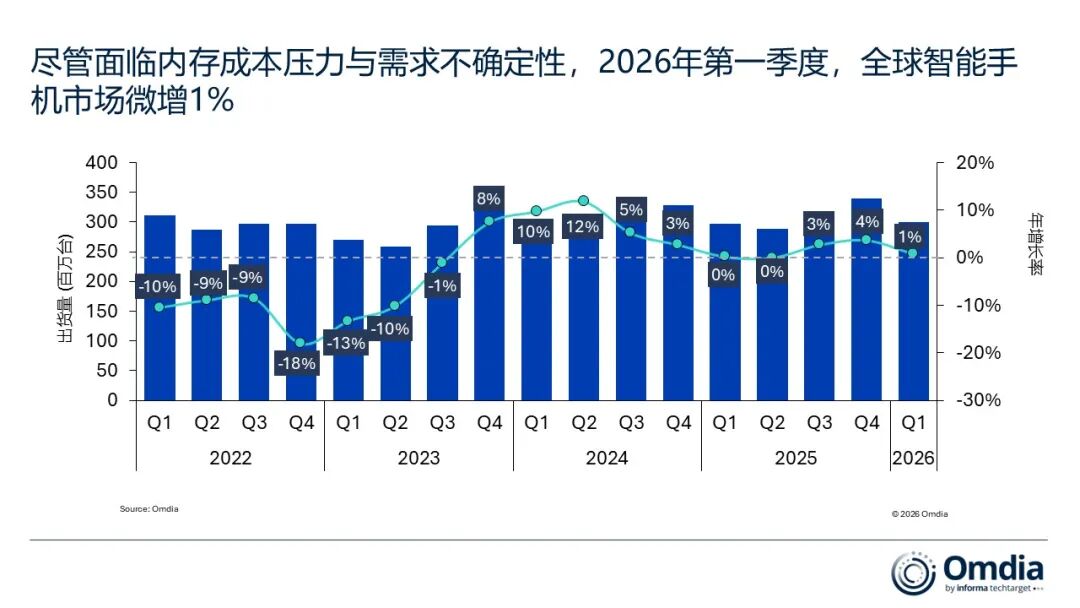 Omdia最新研究显示,2026年第一季度,全球智能手机市场表现超出预期,同比增长1%。不过,由于渠道商提前备货行为在短期内支撑了部分出货量,这一增长尚未完全体现出供应端成本上涨带来的全部影响。内存与存储成本已经开始大幅上涨,但厂商尚未在所有市场全面上调终端零售价。第一季度内存(DRAM)与闪存(NAND)价格环比上涨约 90%,预计第二季度将继续上涨 30%,这会显著推高物料成本。与此同时,物流与贸易流通出现了一定的受阻迹象,进一步加剧了全球供应链的运行阻力。