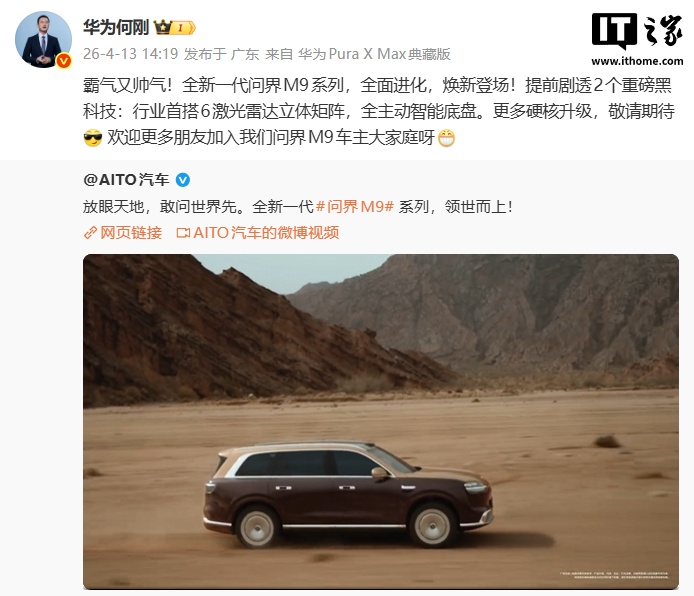 IT之家注意到,华为终端 BG 首席执行官何刚今日发文提前剧透全新一代问界 M9 系列的 2 个重磅黑科技:行业首搭 6 激光雷达立体矩阵,全主动智能底盘。
