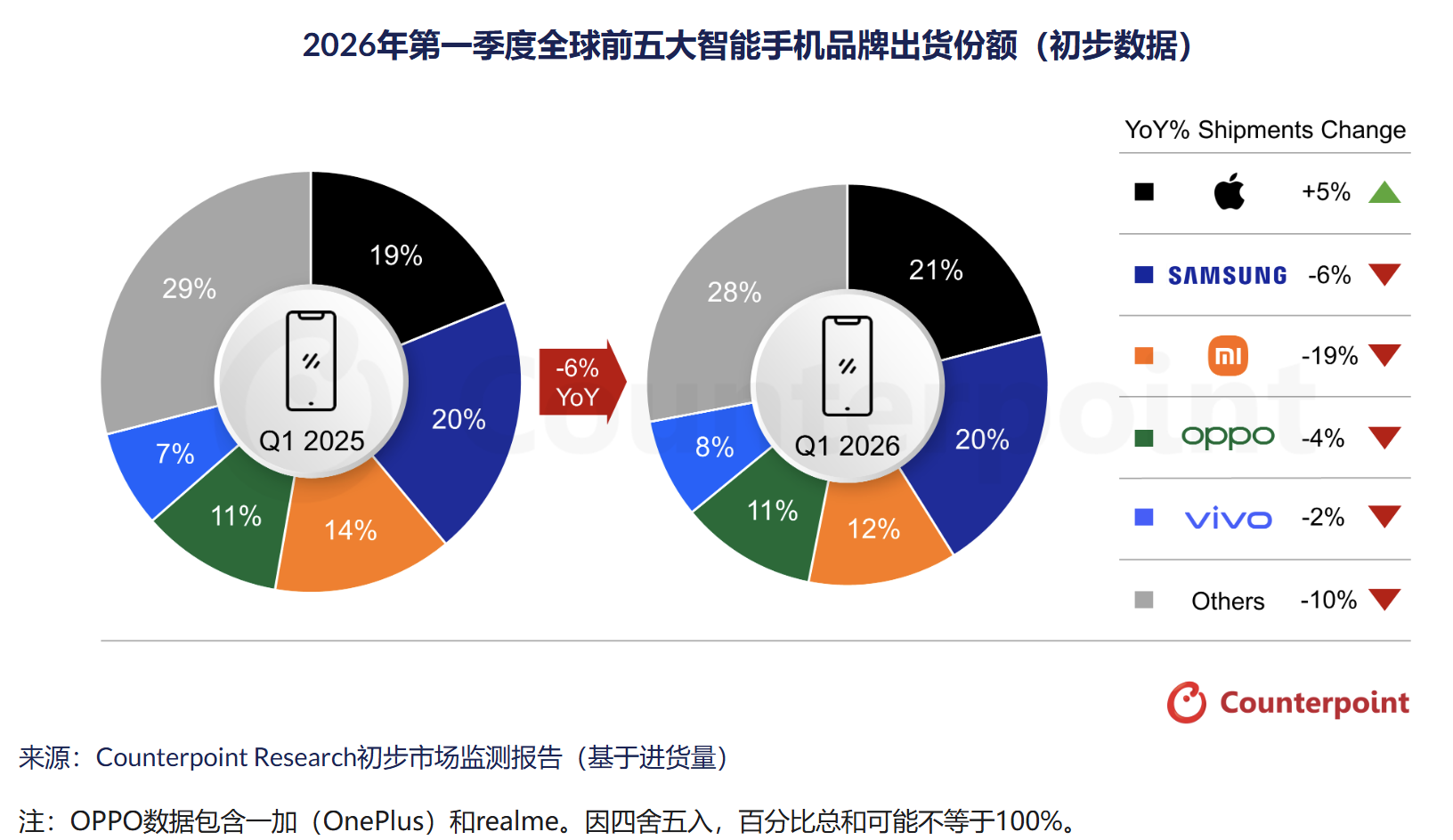C114讯 4月13日消息(颜翊)根据Counterpoint Research市场监测服务的初步估算,2026年第一季度全球智能手机市场持续承压,出货量同比下降6%。这一下滑主要受DRAM和NAND存储组件短缺以及需求疲软驱动。