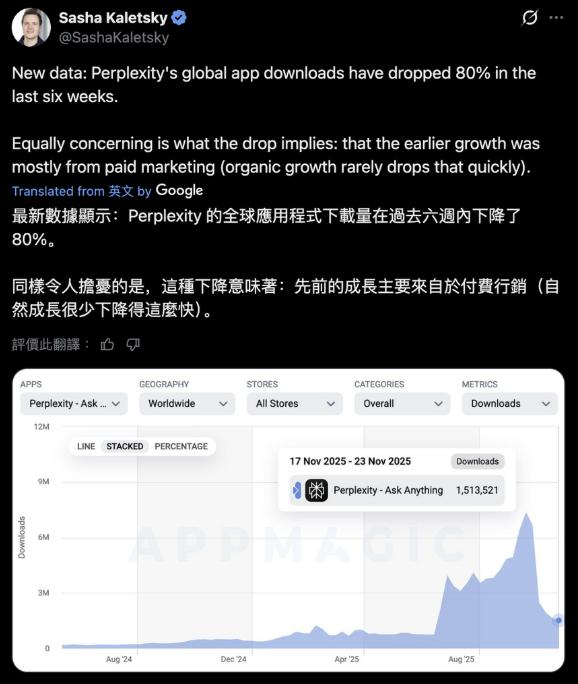 图注:Perplexity在去年下半年出现了80%的下载量下滑。