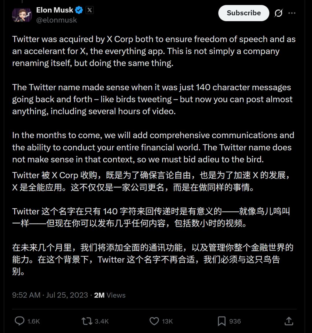 从推特出发,再链接即时通讯、金融支付……老马的野心3年前就昭告天下了。