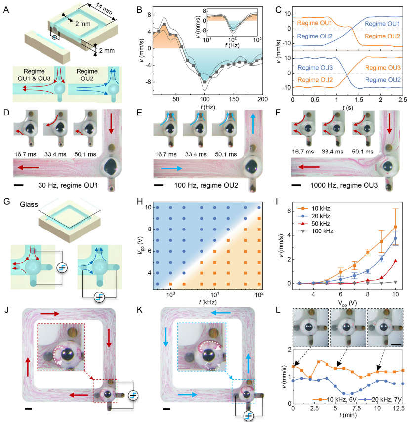 基于上述机理,研究团队进一步构建了几种可编程的毫-微流控平台:基于脉冲方波激励,在通道网络和开放空间中,他们通过集成液态金属液滴并控制电极阵列的工作模式,实现了多路径、多方向的流体逻辑切换与流场拓扑重构;基于无偏方波激励,实现了开放/封闭流体环路的流向与流速调控。这些器件展示了液态金属连续电润湿技术在复杂流场编程中的潜力,且无需依赖任何机械移动部件。与传统驱动方式相比,该研究提出的方法具有低压驱动、流速可调范围广、多模式实时切换、兼容开放与封闭系统以及长期稳定性好等显著优势,为下一代智能、可重构的片上流体系统奠定了坚实基础。