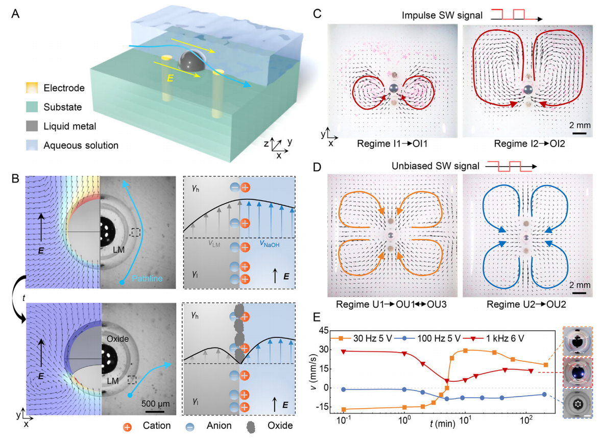 镓基液态金属的连续电润湿效应是驱动毫-微流体的一种高效电驱动方式,仅需约1伏量级的电压即可产生每秒数十倍于液滴体长的强流场。然而,镓基液态金属在连续电润湿过程中自发形成的表面氧化层,长期以来被视为影响驱动稳定性和可控性的干扰因素,其与流场之间的耦合机制尚不明确,严重制约了液态金属连续电润湿效应在毫-微流控系统中的应用。