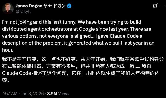 今年1月,Google Gemini API团队的Principal Engineer Jaana Dogan在X上发了一条帖子,迅速获得了数百万次浏览。
