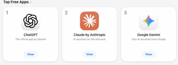App Store排名上,Meta AI因Muse Spark发布冲进前十,Gemini仍然稳居第3,仅次于ChatGPT和Claude。