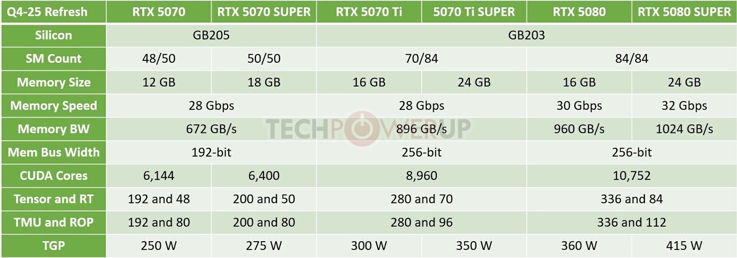 对于消费级市场,此前有消息称英伟达会在 2026 年第 2 季度更新推出三款 SUPER 系列显卡,涵盖 RTX 5070 SUPER、RTX 5070 Ti SUPER 及 RTX 5080 SUPER,最大的亮点是为满足高分辨率游戏与 AI 计算需求,显存容量比非 SUPER 版本增加 50%。IT之家附上相关预估规格如下: