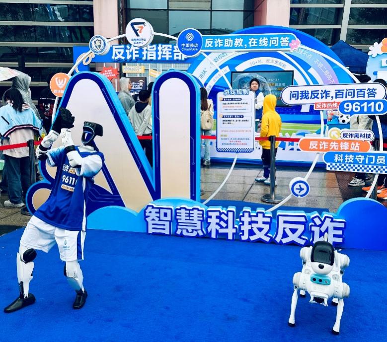 反诈宣传活动现场,灵动的机器狗在人群中穿梭,时而翻滚、时而作揖,引得孩子们争相模仿,家长们纷纷举起手机拍照。一旁的反诈智能机器人则成了“主考官”,随机从海量反诈题库中抽题“拷问”观众,还能实时识别语音答案、判断对错。“所有打着‘刷单返利’旗号的兼职,全都是诈骗,对还是错?”机器人问道。“对!”一位年轻球迷脱口而出。“恭喜你,答对了!”工作人员随即将这位幸运球迷引导至抽奖区试试手气,引来一片欢呼。